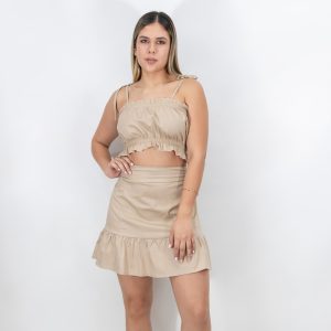Este conjunto combina elegancia y estilo moderno. La falda se une perfectamente al crop top ajustado, creando una silueta femenina. Versátil y chic, es ideal para eventos formales o informales.