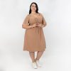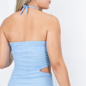 Vestido con abertura a un costado, cuenta con elástico en la espalda para mayor comodidad.